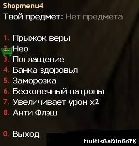 По всем вопросам скайп : sn1k3rs_ Автор : Sn1k3rS Описание : Зэки не могут использывать Невидимости , 500hp + 500armor Если же вы хотите , чтобы зэки могли использывать эти функции пиши в скайп : sn1k3rs_ (Сделаю бесплатно) Команда вызова : jb_vipmenu